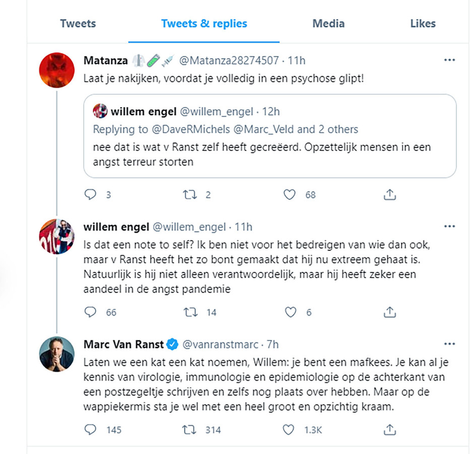 Trollen Starten Nieuwe Actie Tegen Marc Van Ranst Op Twitter Ben Je Nu Trots Dat Je Ook Een Doodsbedreiging Kreeg Buitenland Hln Be from images0.persgroep.net „ik ben helemaal klaar met deze oplichter, en ik kan enkel maar suggereren. Kom er hier alles over te weten achter het tabblad bibliotheek neteland. Dat heeft blogger en ondernemer alexander klöpping gemeld op twitter. Engel klaagt de wetenschapper aan voor smaad en laster. Na een reeks beschuldigingen over en weer ligt er nu ook een aangifte. Jun 13, 2021 · ook belgische viroloog marc van ranst schreef dat hij het account van engel heeft „gerapporteerd en geblokkeerd". May 28, 2021 · de polemiek tussen viroloog marc van ranst en de nederlandse dansleraar willem engel (van viruswaarheid) loopt verder uit de hand: May 28, 2021 · het aanhoudende conflict tussen de nederlandse coronascepticus willem engel en viroloog marc van ranst dijt steeds verder uit.